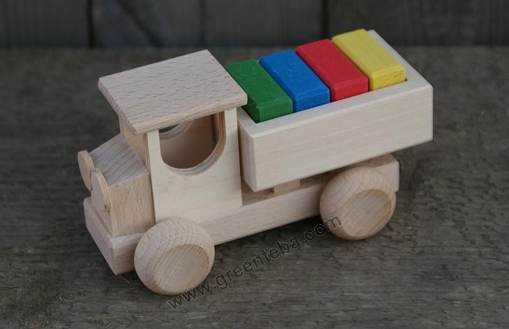 LKW aus natur Holz mit 4 bunten Holzklötzen. Grösse Holzklötze: 3,5x2,5x1,5 cm Grösse LKW LxBxH: 10,3x6,7x7,3 cm Für Kinder ab 3 Jahren. Handmade in CZ.